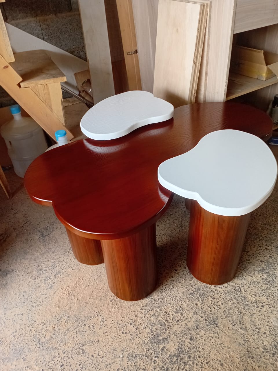 طقم طاولات بتصميم عضوي مستوحى من السُحب، يجمع بين سطح خشبي لامع وقِطع عُليا باللون الأبيض المطفي لطبقات عرض أنيقة. لمسة حديثة تُبرز ديكور المجلس وتسهّل ترتيب الضيافة.